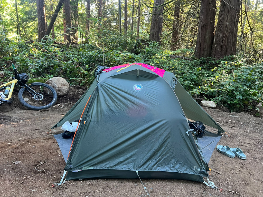Naše letošní cesta po Vancouver Islandu byla trochu složitější. Nebyl v plánu jen bikepacking, ale taky hodně ježdění nalehko a spíš bikepackingové přejezdy terénem a taky nějaká práce na etapáku BC Bike Race. Potřebovali jsme tedy víc věcí než obvykle. Na bajka tedy trochu nezvykle balím velkou zadní podsedlovku, přední brašnu na harness a na to přidělávám stan. Tohle řešení není ideální, občas se u toho rozčílím, při troše snahy ale funguje a vše drží jak má. Akorát to teda není už tak rychlé, jak pouhé přidělání přímo na řídítka. Za to, ale brašna nemůže 😊