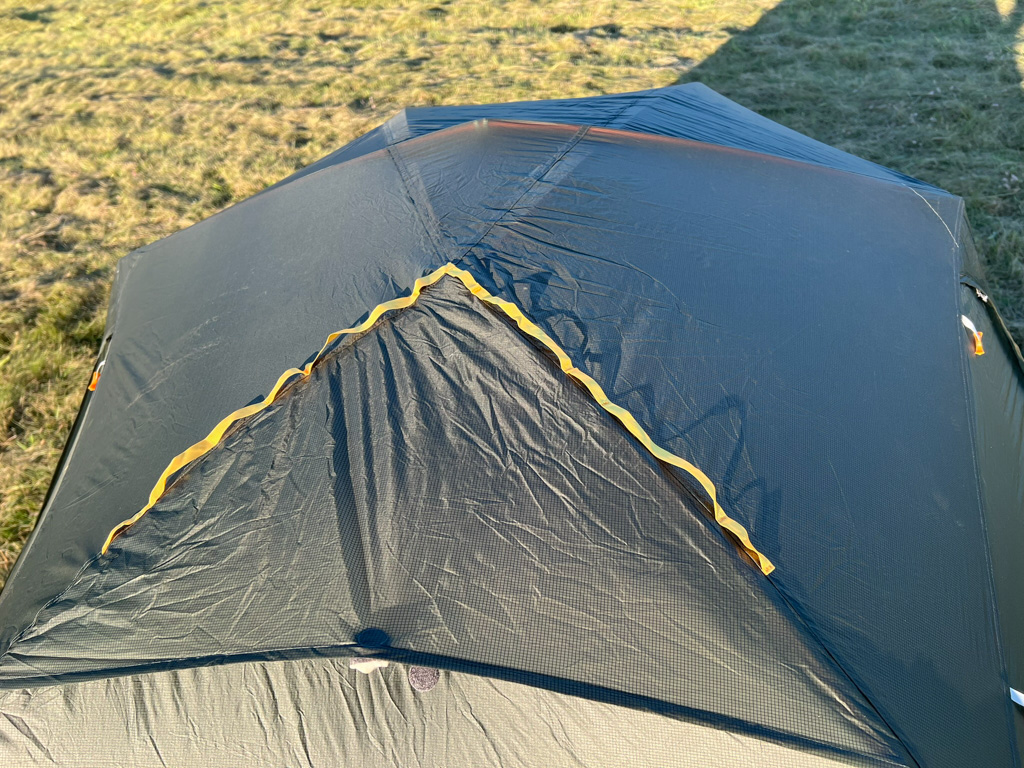 Když se mi v roce 2021 tarp dostal poprvé do rukou před mou plánovanou pěší poutí do Istanbulu, tak mě překvapila nejen extrémně nízká hmotnost – samotný přístřešek váží pouhých 460 gramů, ale také sbalitelnost do vaku 30 x 10 cm (když se člověk vynasnaží, tak jej sbalí i do poloviční velikosti). Přitom hned na první dobrou je vidět kvalitní zpracování, což se potvrzuje i na použitých materiálech. Tkanina ze silikonizovaného nylonu je nejen voděodolná, ale taky vzhledem k váze poměrně bytelná.