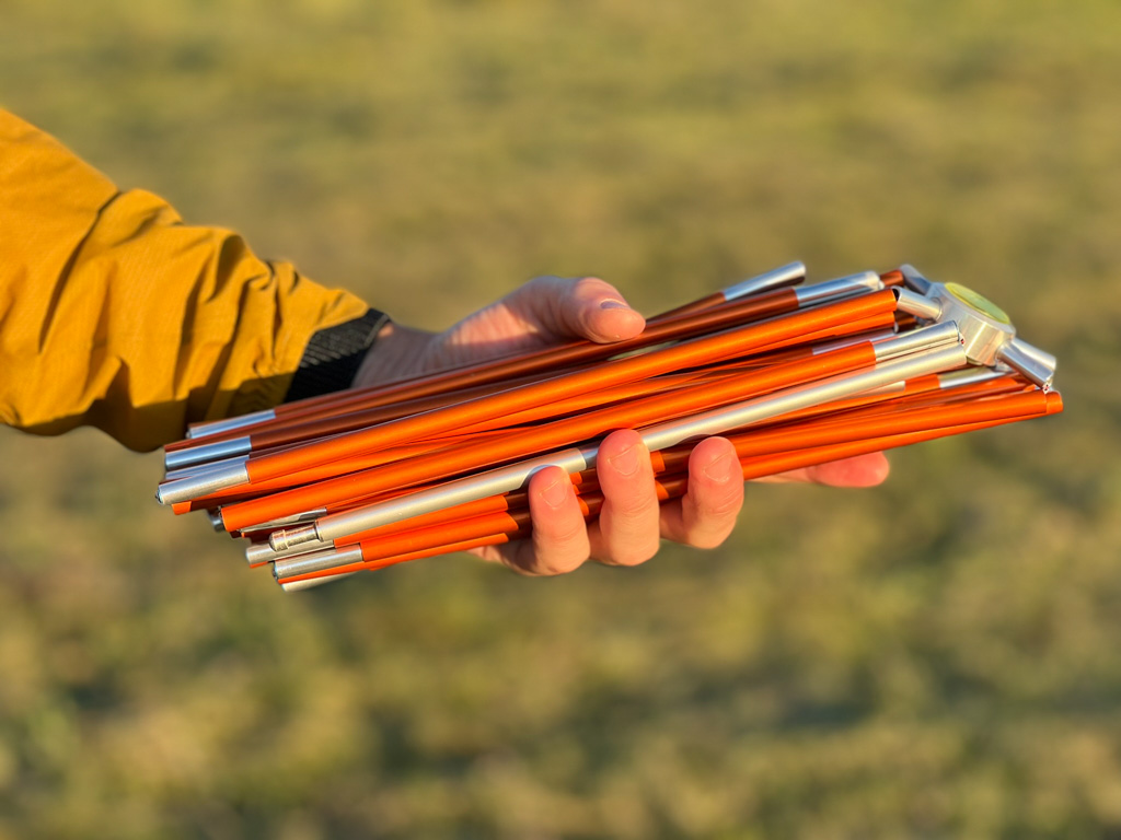 Stan se pyšní dvouplášťovou konstrukcí a jeho stavba je velice jednoduchá. Vnitřní stan rozložíš na zem, vyndáš kratičké (30 cm) tyčky, samy do sebe naskáčou. Řešíš jen stranu, která kam patří. Jak už jsem psal výše, stan je kónického tvaru, a tak je pomyslné X z tyček u hlavy s větším rozpětím, je to dobře rozpoznatelné a jednoduché. Tyčky i kolíky jsou od věhlasné značky DAC. Výhodou takhle krátkých tyček je, že je můžete sbalit i jinam než do samotné brašny na stan, vejdou se pohodlně i do rámovky. Jediné, co bychom vytkli, je barva obalu, jak tyček, tak kolíků. Tmavě zelená je fakt neviditelná a hodně krát se nám stalo, že jsme je pohledem chvíli hledali 😊