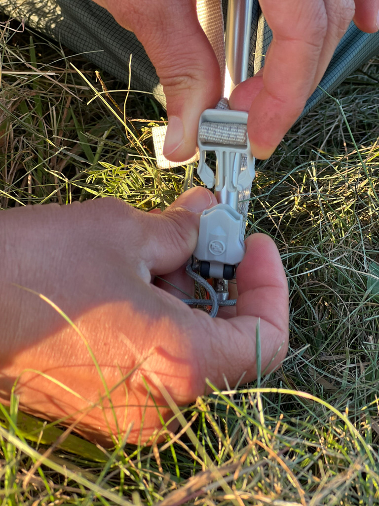 Přezky jsou specifické s prostřední částí rozdělenou na dvě a je důležité být přesný a nezastrčit přezku zešikma. Vnitřní stan je z kombinace prodyšného nylonu a polyesterové síťoviny. Všechny švy jsou přelepené vodotěsnou PU páskou bez rozpouštědel (PVC a VOCs free), přičemž samostatná podlážka a tropiko jsou ze silikonizovaného rip-stop Nylonu s vodotěsným PU zátěrem zevnitř. Za měsíc používání, jsme měli pár krát silnější kondenz, ale nic, co by ranní slunce a vyklepání rychle nevysušilo. Zde se naopak tmavě zelená barva tropika velice hodí. Taky je hezky neviditelná mezi stromy a v přírodě jako takové 😊