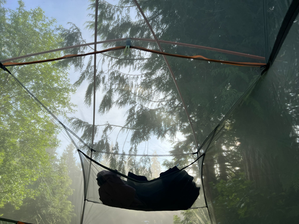 Jednoplášťová konstrukce ale logicky přináší určité výzvy s kondenzací – nejednou se mi stalo, že mi pršelo na hlavu uvnitř tarpu, ačkoliv venku nespadla ani kapka, ale člověk se zkrátka stále učí. Větrací otvor v horní části a vypnutí přístřešku výše nad zemí (i díky integrované moskytiéře, takže se člověk nebojí hmyzu) pomáhají vlhkost omezit na minimum. Na hlavní vypínací šňůře je navíc prusík s plastovým háčkem, a tak si můžete stříšku nad “předsíňkou” vyhrnout nahoru, nebo stáhnout dolů podle podmínek, abyste dosáhli dobré ventilace. Navíc hlavní vypínací šňůra má utahování uvnitř, a tak si můžete tarp při dešti dovypnout pěkně ze spacáku. Horní větrání by tedy sice mohlo být lepší, ale při správném výběru místa a postavení se dá kondenzaci dobře předejít. Jak bojovat s kondenzací u stanů se můžete dočíst zde.